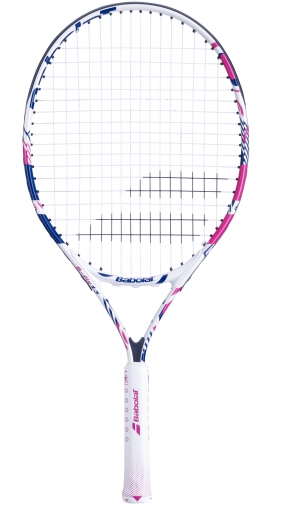 tenisová raketa v růžových barvách, které ocení všichni malé tenisové hráčky, kteří vybírají barevnou a lehkou raketu. Je vhodná pro tenisové začátky dětí kolem 7-9 let s výškou do 130 cm. Délka je ca 58,5 cm.