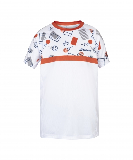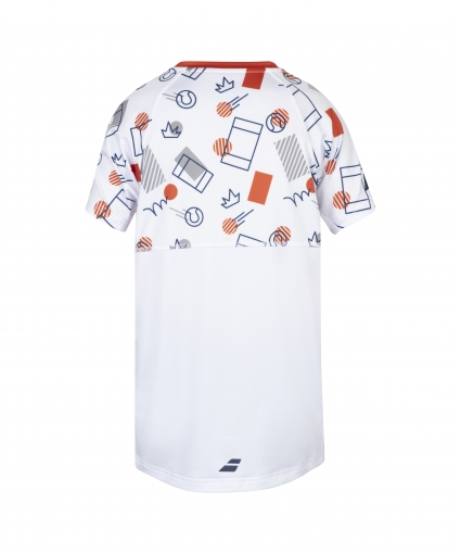 Tenisové funkční tričko s nápisem Babolat, bílé s barevným potiskem. Kolem krku je oranžově lemované a má i oranžový proužek.
