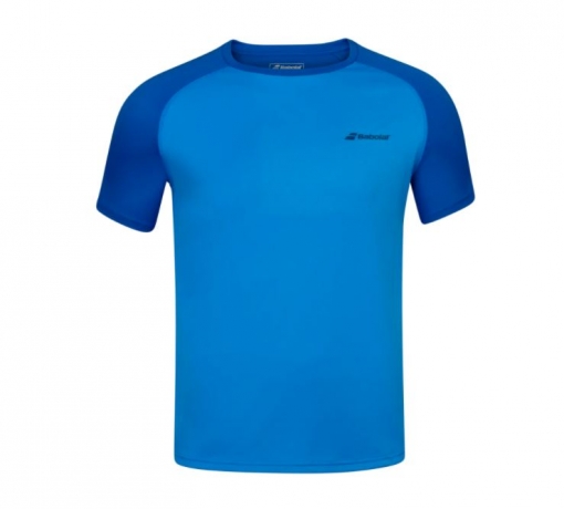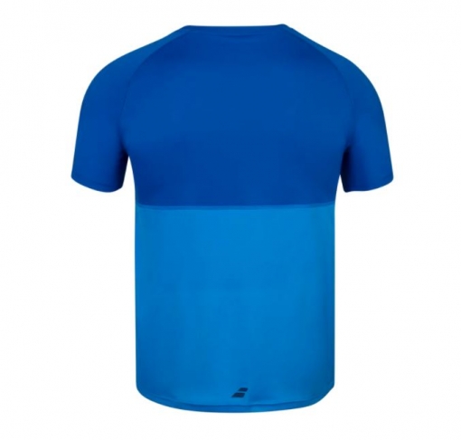 Tenisové funkční tričko s nápisem Babolat, tmavě modré detaily na ramenou a zadním díle.