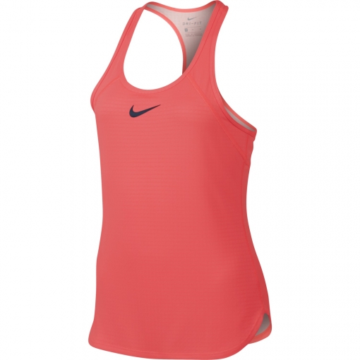 Růžové dívčí tričko bez rukávů pro tenis i další sporty. Z funkčního materiálu. Jemně perforované pro lepší cirkulaci. Tričko má ploché švy pro pohodlné nošení. S tmavě modrým znakem Nike na předním díle.