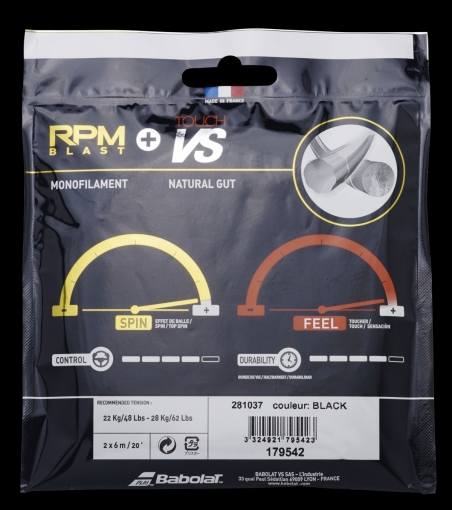 Chcete všechno: rotaci, kontrolu, cit, sílu a odolnost... a RPM Blast + Touch VS vám to poskytne při každém úderu! Tato hybridní kombinace strun zlepší vaši hru díky bezkonkurenční síle a hratelnosti. Široce používaná hráči ATP tour. Vyrobeno ve Francii.